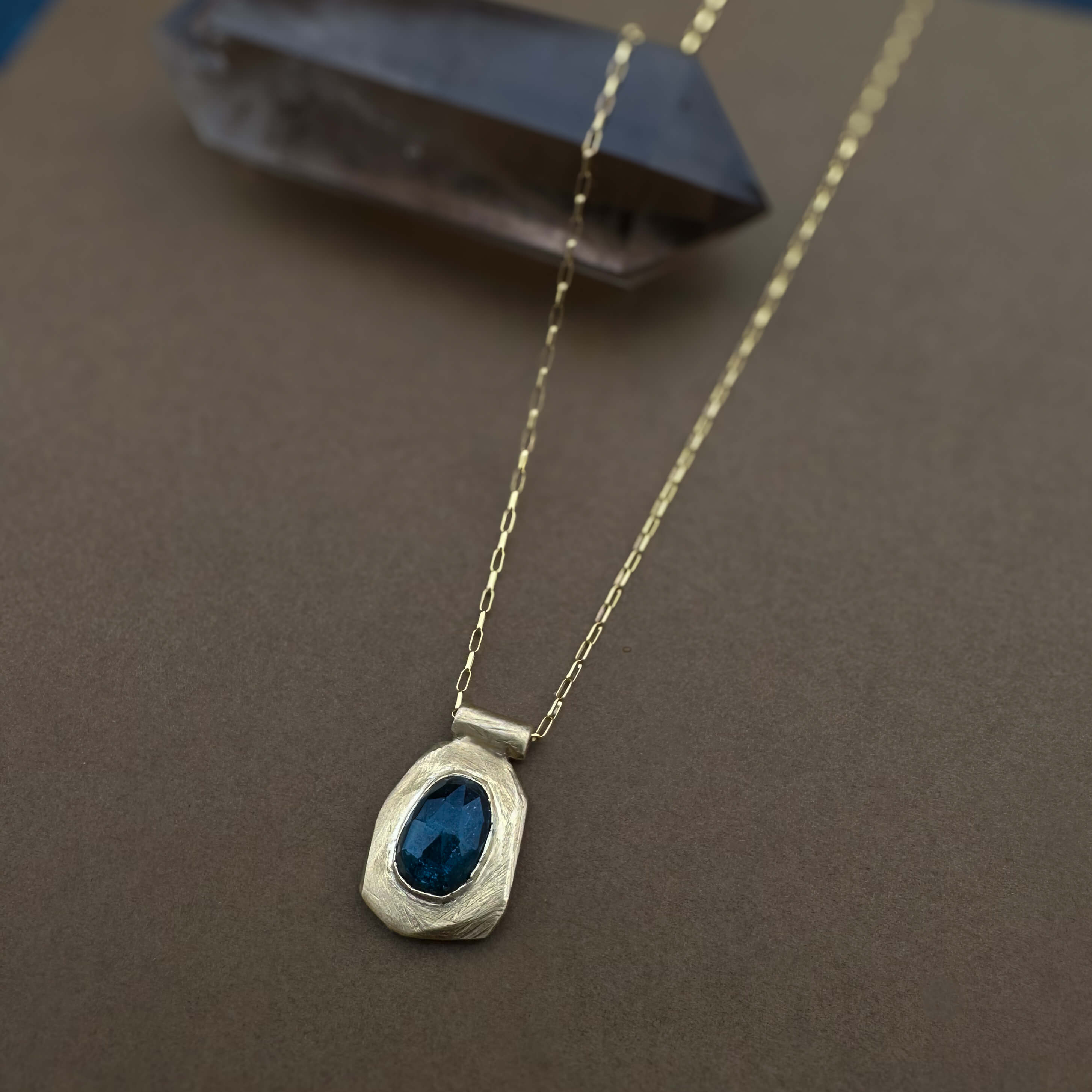 Materials Include:Â Teal Moss Kyanite (approx. 14mm in length), Brass, 10K Solid Gold or .925 Sterling Silver. Pendant comes on an 18″ 14k gold-filled chain.